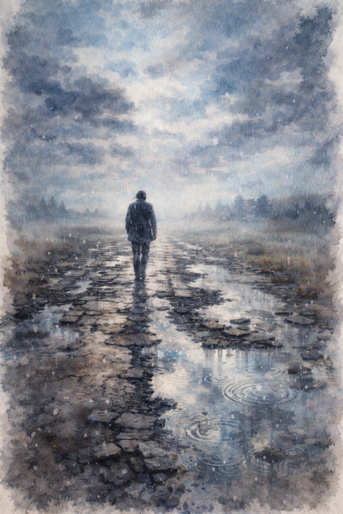 Under a sky where grey dissolves into blue, rain whispers forgotten stories. Each drop echoes memories that refuse to settle, while broken roads mirror a journey left incomplete. In the quiet rhythm of falling rain, the heart wanders…searching, remembering, and learning to carry the weight of what once was.